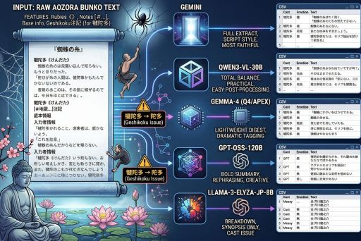 青空文庫の生テキストをそのまま入力し、各LLMに「キャスト・感情・文章」のCSV形式で 音声台本を抽出させたベンチマークです。今回は、原文保持性・感情付与・フォーマット安定性・実運用のしやすさを中心に比較しました。
